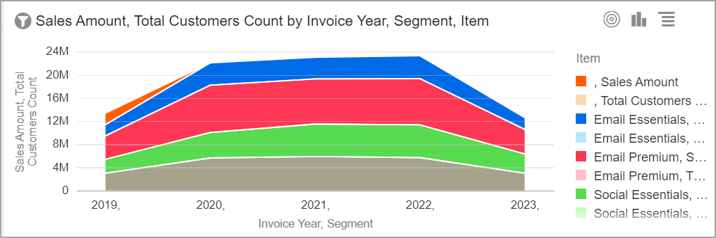 Los gráficos de área son similares a los gráficos de líneas, pero añaden sombreado entre la línea y una línea de base. Los gráficos de área son útiles para realizar un seguimiento de los cambios en dos o más grupos relacionados que componen una categoría completa. |