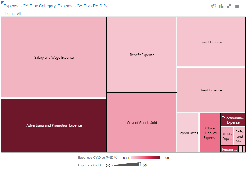 Los diagramas de rectángulos representan un conjunto jerárquico (estructurado en árbol) de datos. Los diagramas de árbol no indican necesariamente los valores numéricos exactos, sino que dividen el conjunto de datos en partes e identifican rápidamente los componentes más grandes y más pequeños. |