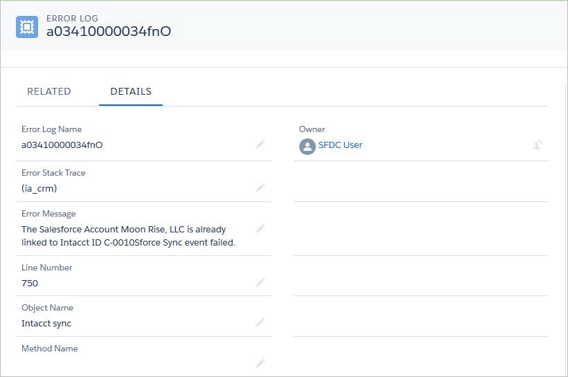 Puedes ver el estado de sincronización de registros individuales en las listas relacionadas con la sincronización de Intacct en Salesforce. Los errores también se enumeran y pueden ayudar a determinar cuál es el problema de sincronización y cómo solucionarlo.