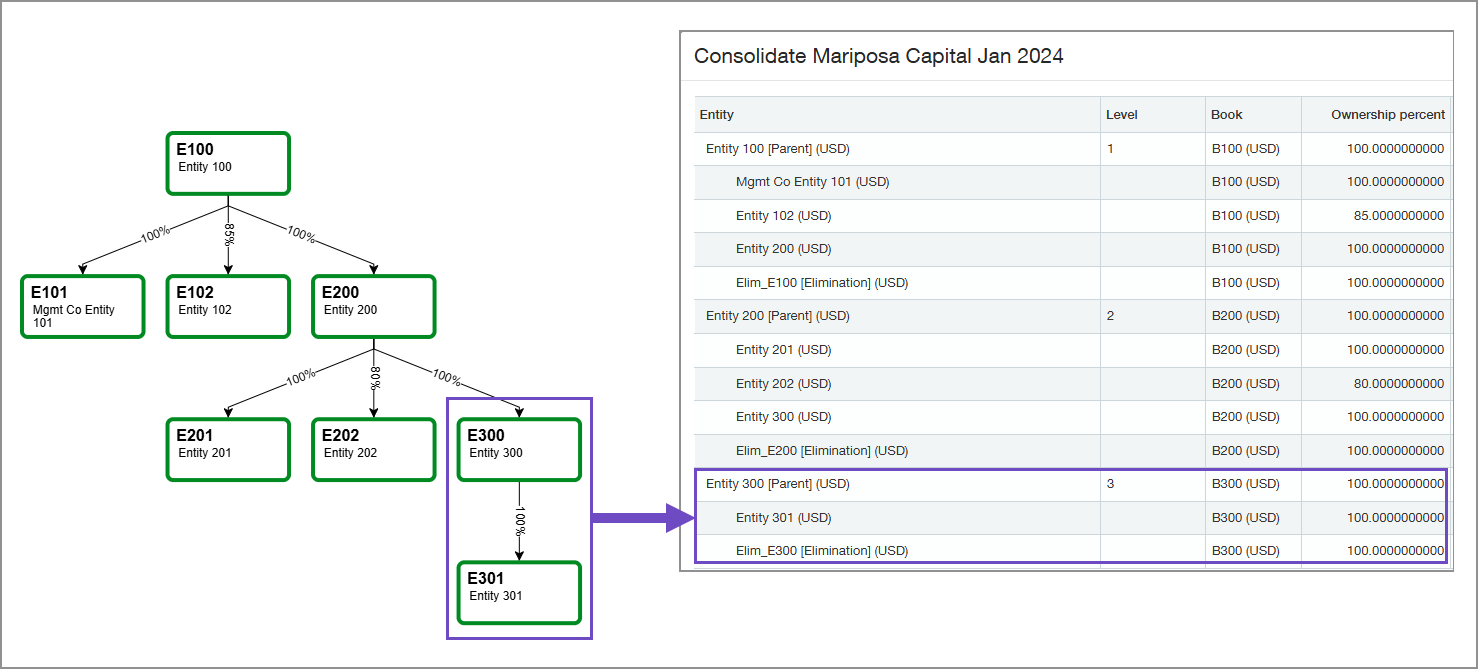 | Entity E301 | 3 | B300 | 100% |
