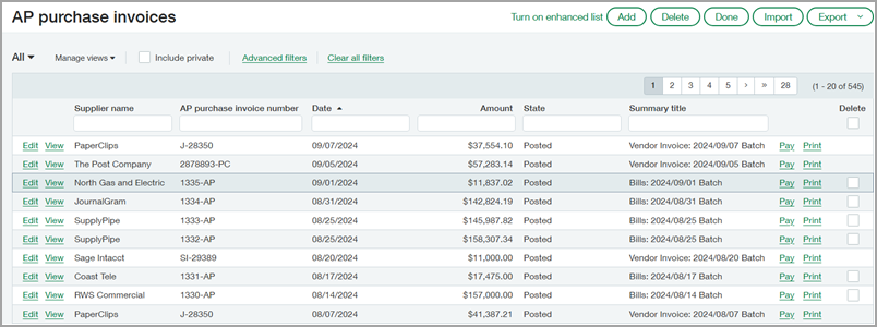 Chaque ligne est un enregistrement de facture fournisseur ou une transaction individuelle. Depuis la liste, vous pouvez effectuer des actions sur ces fiches individuelles à l’aide de l’icône Modifier,Vue, Payeret Imprimer boutons. Vous pouvez exporter une liste de tous ces enregistrements. Vous pouvez utiliser les colonnes pour trier ou saisir les zones de colonnes à filtrer. En résumé, lorsque vous êtes sur une liste, demandez-vous «Qu’est-ce que je recherche précisément ?". Les listes sont un élément clé d’Intacct. Veillez donc à vous familiariser avec elles et à comprendre comment les utiliser au mieux.
