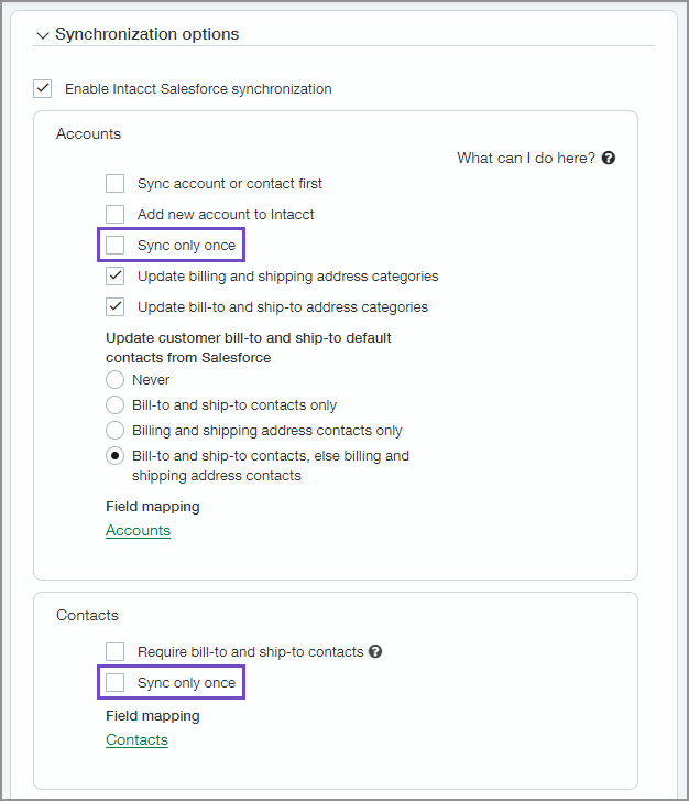 Lorsque cette option est activée, les comptes et les contacts sont synchronisés de Salesforce vers Intacct uniquement au moment de leur création. Toute mise à jour apportée aux comptes ou aux contacts dans Salesforce ne sera pas synchronisée avec Intacct après la création du compte ou du contact.