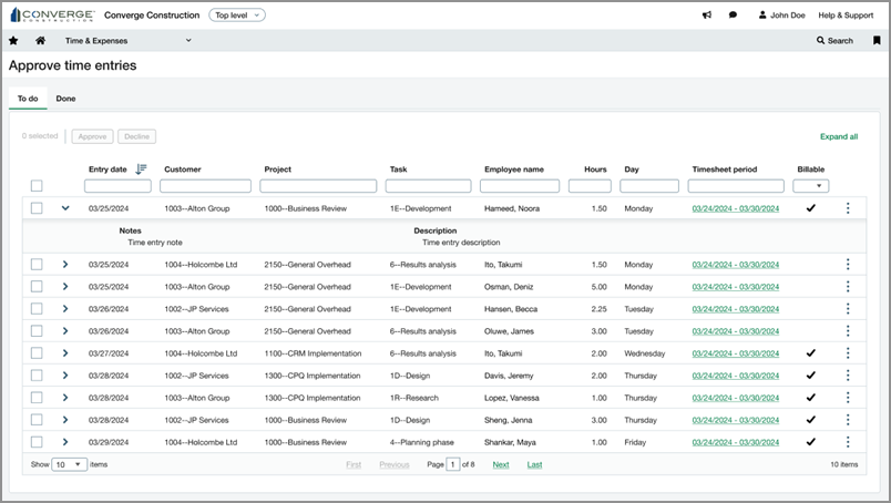 Nous avons repensé la page d’approbation pour améliorer votre expérience, en l’harmonisant davantage avec les flux de travail habituels d’Intacct. De plus, nous avons introduit une nouvelle page pour valider les saisies des heures par projet, client ou tâche.
