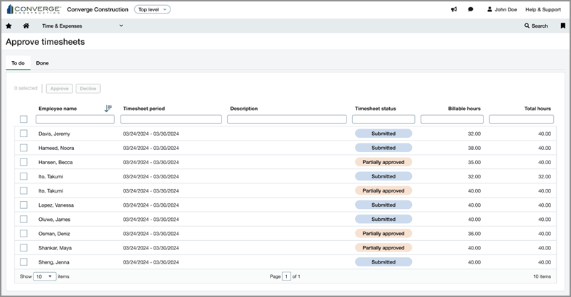 Temps et dépenses >Tous > Approuver les feuilles de temps