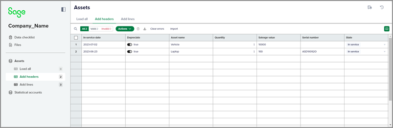 Voici un exemple de flux de travail de haut niveau pour l’importation des actifs. Pour des instructions plus détaillées, consultez le Centre d’aide Sage Intacct.