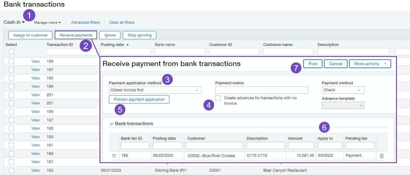Rationalisez votre flux de réception des paiements des Comptes clients tout en accélérant votre processus de rapprochement avec le flux de travail de l’assistant de transaction bancaire.