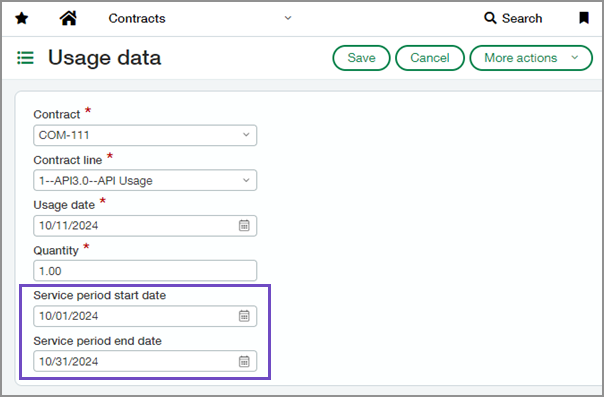 Les lignes de contrat existantes et les enregistrements d’utilisation ne comporteront pas les champs de date de période de service par défaut, mais vous pouvez facilement ajouter les dates manquantes lors de la génération des factures.